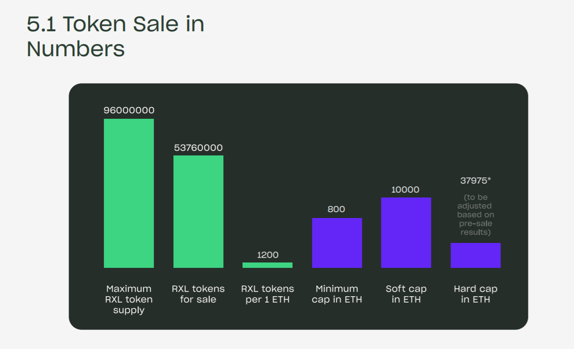 There will be 2 sales, pre sale and the main crowd sale. There will be total of 96 000 000 tokens in circulation and in the main crowd sale there will be available 50% of all RXL tokens.